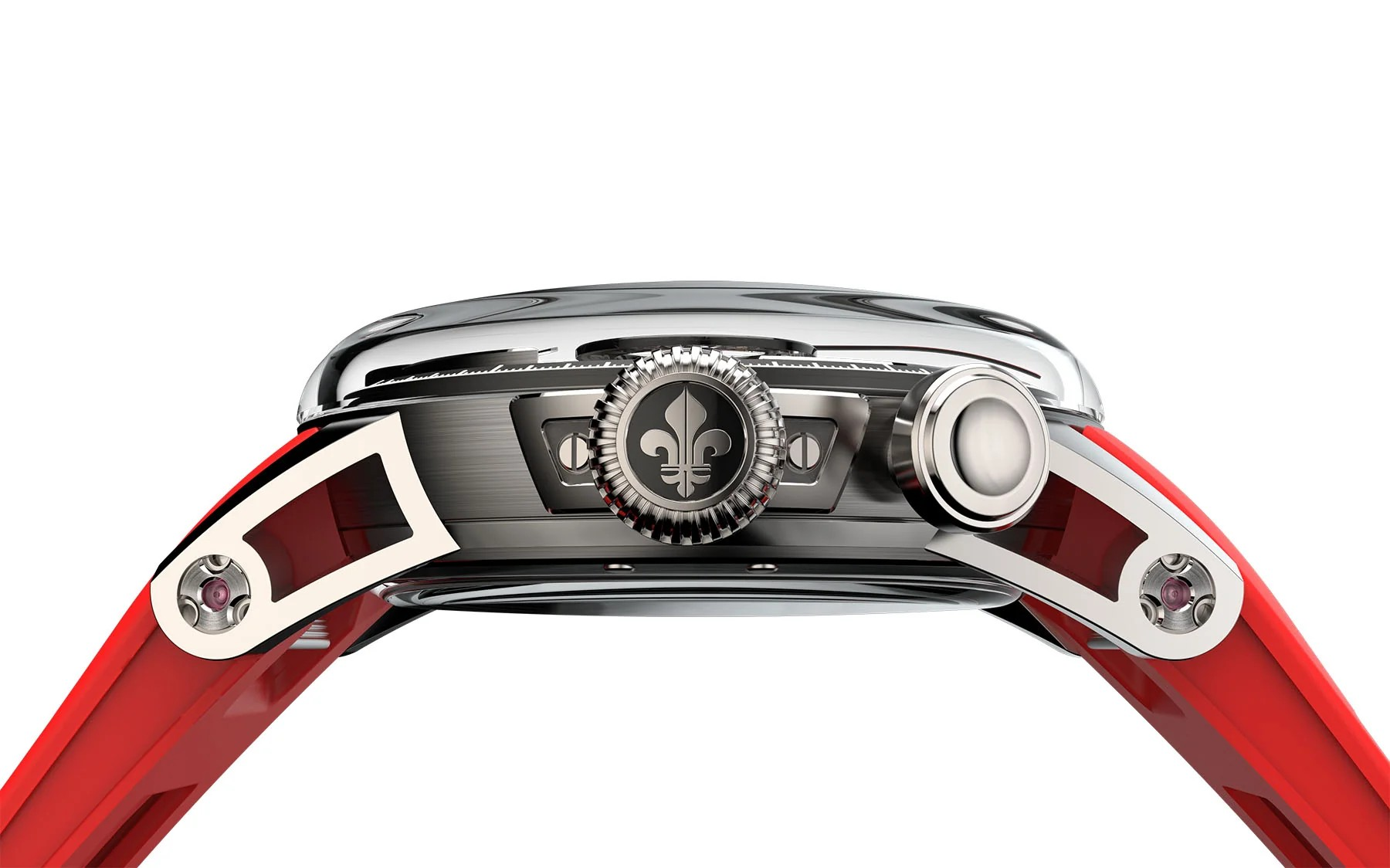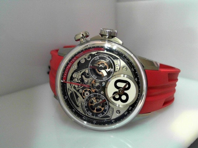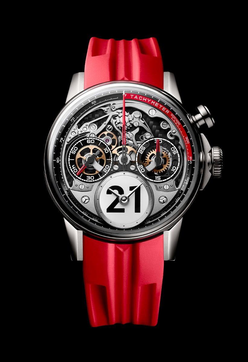 Louis Moinet LM-96.20.8R –20mm limited edition skeleton dial chronograph in titanium with red accents, powered by automatic LM96 caliber.
