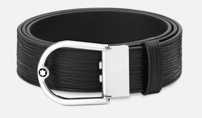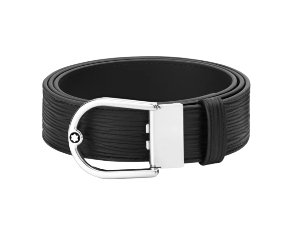 Montblanc 35 mm Horseshoe Buckle Belt in Printed Black/Plain Black, combining style and versatile leather craftsmanship.