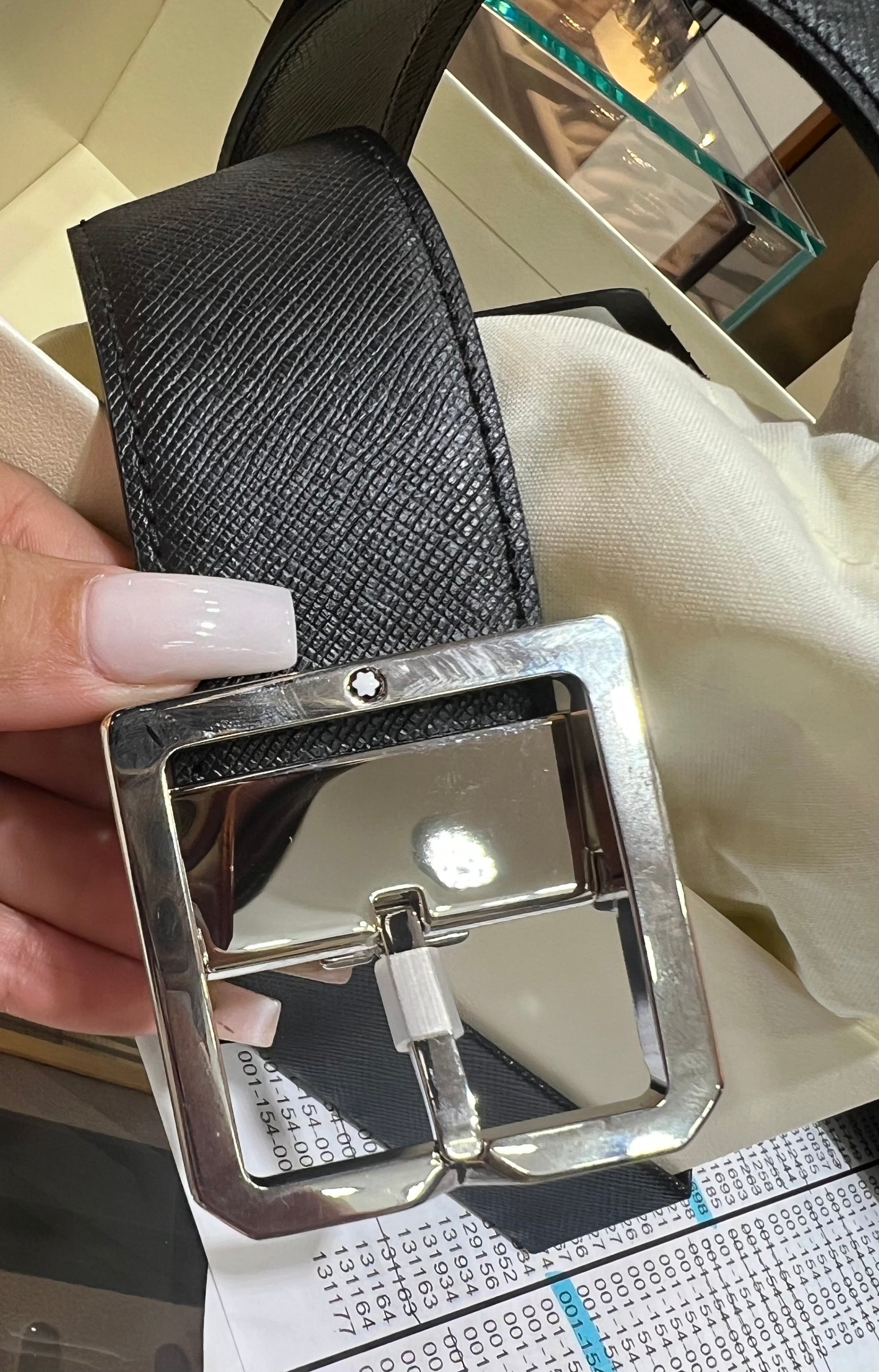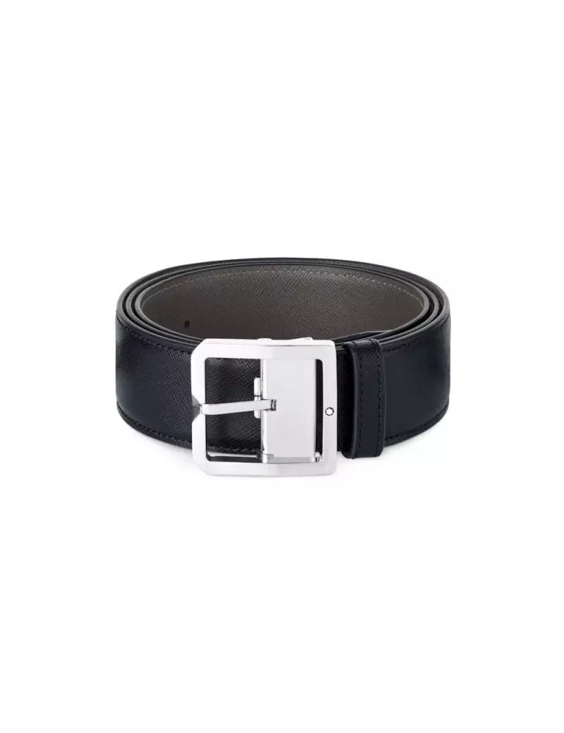 Montblanc 131162 reversible black/grey 40mm Saffiano leather belt with square pin buckle—sleek, versatile, and refined.