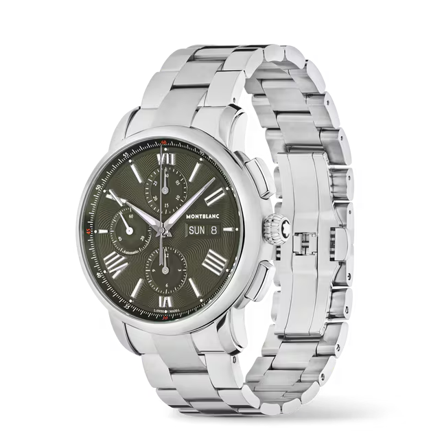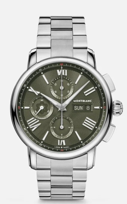 Montblanc 133298: 42mm chrono with MB 25.13 caliber, green glacier dial, 2024 release, 22mm lug, 48h power reserve.