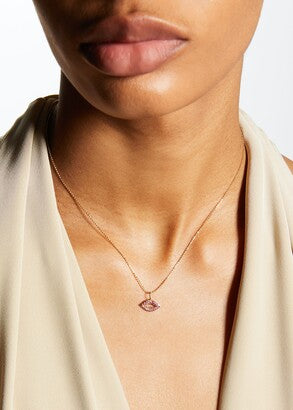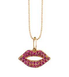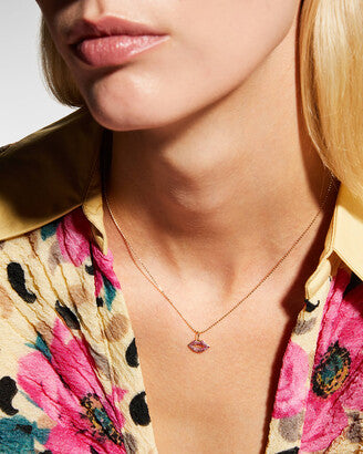 14K Yellow Gold Ruby lips necklace with adjustable 16/18" chain, featuring vibrant rubies and 0.49ct diamond sparkle.