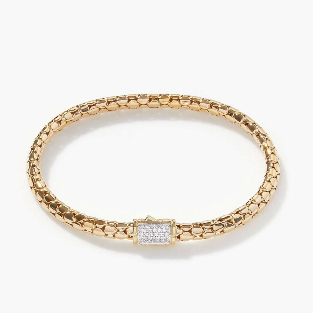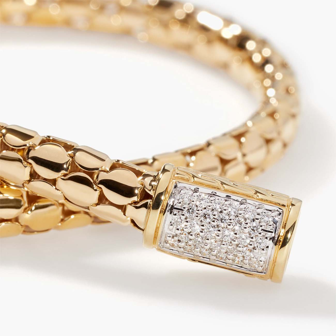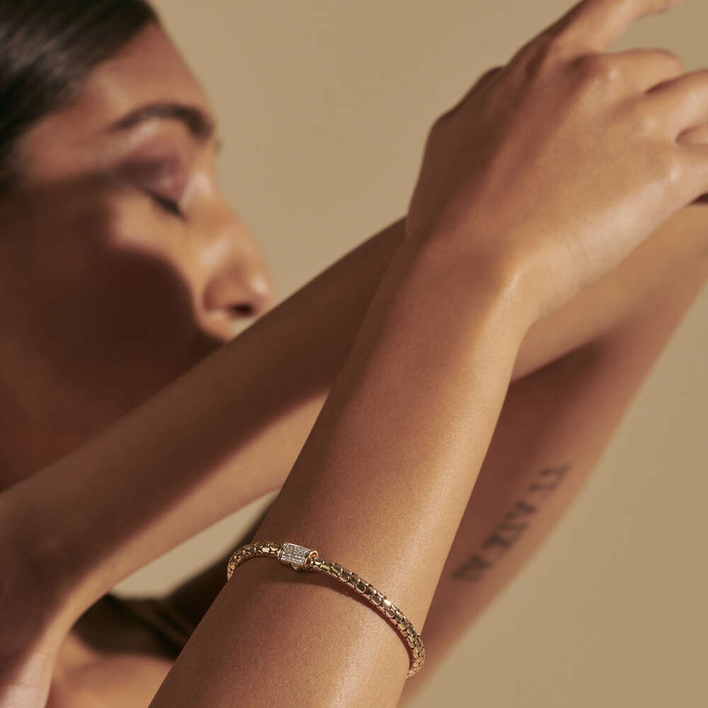 The Dot collection from John Hardy presents this bracelet with a sunny disposition. Crafted in 18K yellow gold, it features a design with repeating spots, a pave diamond station, and a pusher clasp that makes it easy to put on and take it off. The piece is 4.5mm wide. There’ll be no circling around the compliments you’ll get when you wear this John Hardy bracelet!