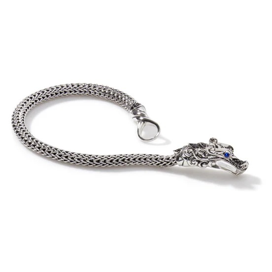 Sterling Silver Naga Bracelet with black sapphire, black spinel, and blue sapphire eyes.