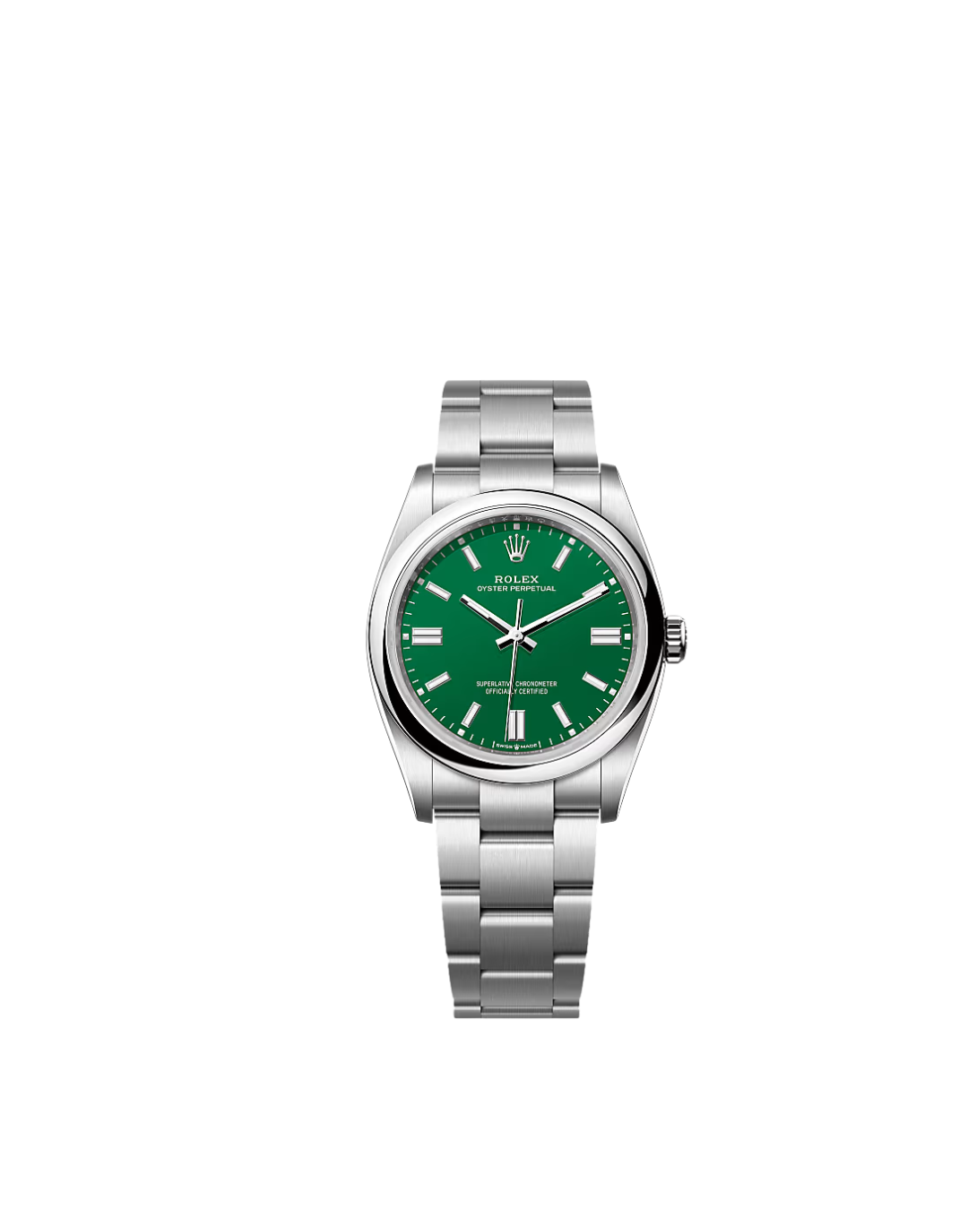Unworn Rolex 126000 with a striking green dial. 36mm Oyster case, Caliber 3230, 70-hour power reserve, 100m water resistance. Classic elegance.